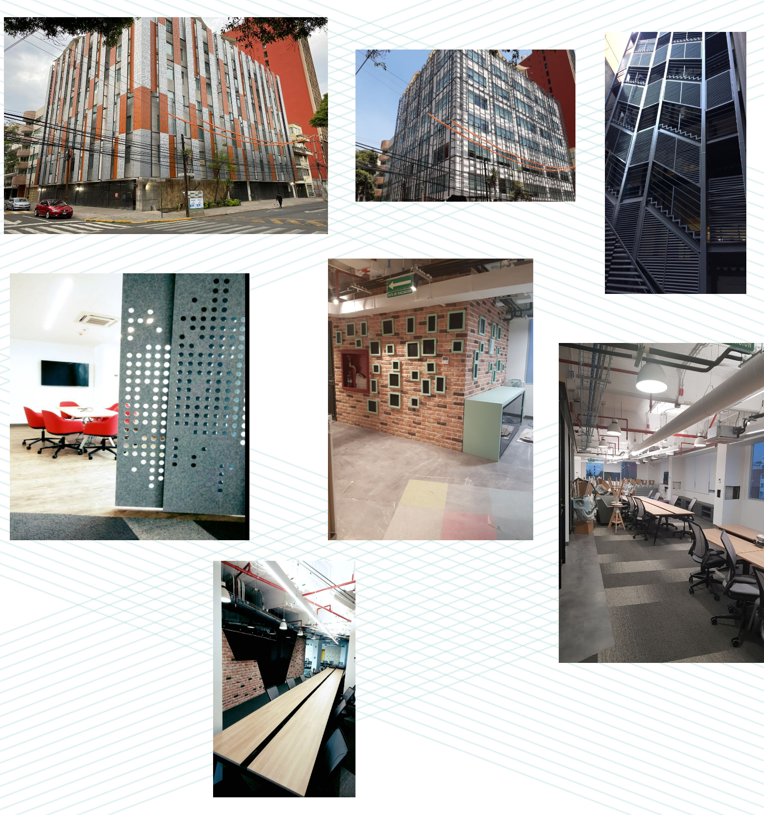 Remodelación de oficinas y Mezanine, Baños, Escaleras, Vestíbulos, Áreas de Oficinas, como colocación de pisos, alfombras, instalaciones eléctricas, instalaciones especiales, aire acondicionado, Contra Incendio, Voz y Datos, Tablaroca, Plafones Lisos y Reticulares, Muros, Nivelación de Pisos, Herrerías, Carpinterías, Cancelería de Aluminio, Plomería y Colocación de Muebles Sanitarios y Especiales, Pintura en Muros y Plafones.
